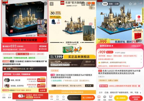 霍格沃兹城堡在拼多多乐高品牌卖693元,但在淘宝卖1329元,京东卖909元。拼多多比淘宝的价格低了48%,比京东的价格低了24%。