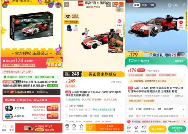 比如保时捷963赛车模型,拼多多奥莱店卖124元,淘宝官方旗舰店卖249元,京东自营旗舰店卖174元,拼多多比淘宝便宜了50%,比京东便宜了29%。