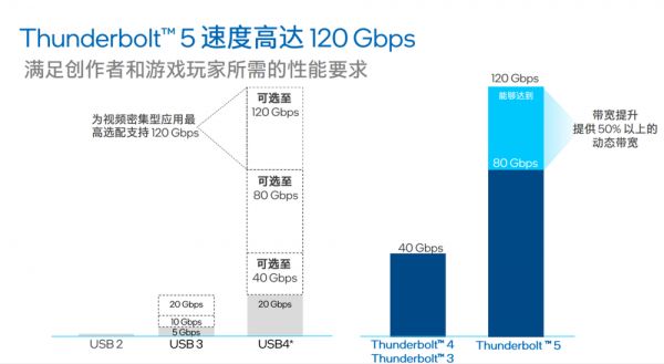 相比前代,雷雳5在视频传输、数据传输方面拥有更高的带宽,峰值速度最高能够达到120 Gbps。