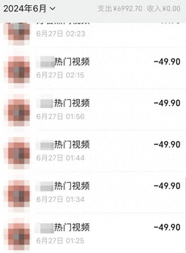 6月27日凌晨1点25分,她向“XX热门视频”支付了49.9元,随后每隔约10分钟就支付一次;