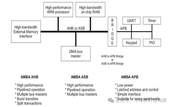 共享总线片上通信系统结构一般比较简单,硬件代价也小,但带宽有限,而且带宽也没法随着IP的增多而进行扩展。ARM公司在1996年提出的AMBA总线广泛应用于嵌入式微处理器的片上总线,现已成为事实上的工业标准。