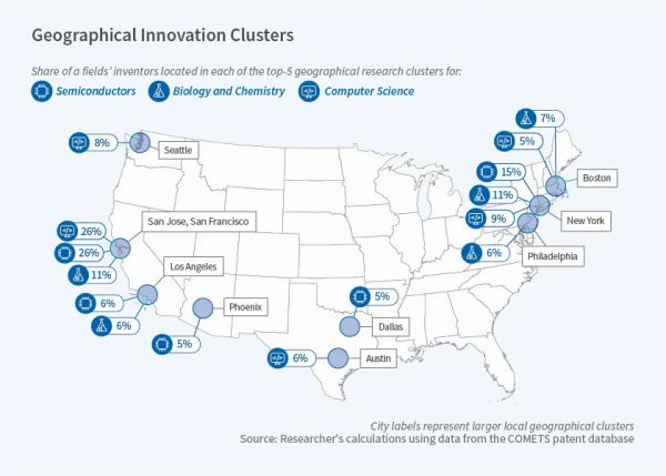 截至2009年,计算机科学排名前10位的都市区拥有美国科学家总数的70%,半导体领域的科学家占79%,生物和化学领域的科学家占59%。