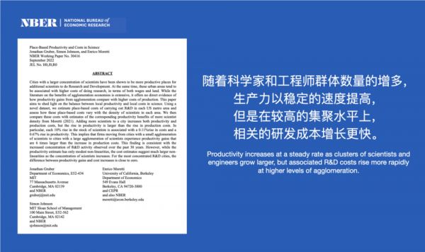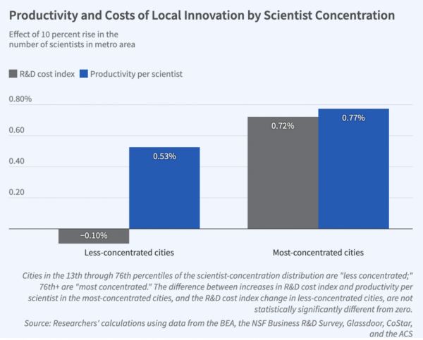 但在波士顿和旧金山等具有最高集聚度的城市地区,成本的增加几乎抵消了生产率收益的增加——更多科学家是会带来更高的生产力,但其成本增加也迅速攀升,总体来说收益不是很大。