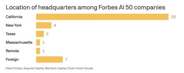 福布斯发布的人工智能50强名单中,上榜的43家美国公司仅来自四个州,其中加州尤为突出,拥有高达35家公司;