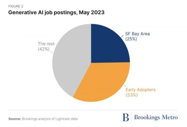 根据来自Lightcast的2023年1月至2023年5月的职位发布数据,仅六个都市区(旧金山、圣何塞、纽约、洛杉矶、波士顿和西雅图)就占据了全美国生成式人工智能职位发布的近一半(47%)。