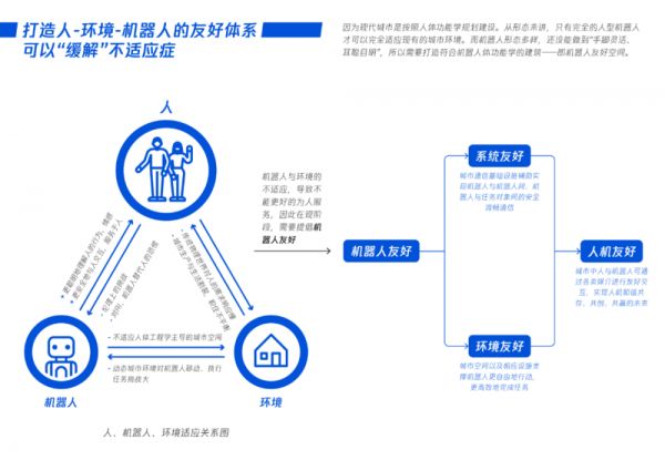 因此,应该从人-机-环三者关系看待机器人,并为其更好地为人服务,探索让机器人和环境双向适配的合理路径。在《人机友好空间探索》研究中,我们建议打造人-机-环友好体系,让机器人和环境更好地“双向奔赴”,最终目标是推动更好地为人服务。