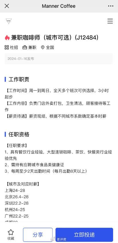 风暴中心的 Manner,今年也开辟了 “兼职咖啡师” 的岗位招聘,据接近 Manner 的消息人士向知危透露,兼职主要负责门店外卖打包、卫生清洁、顾客接待,不参与咖啡制作,且兼职的占比很低。