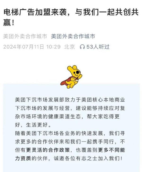 先是7月11日,“美团外卖合作城市”微信公众号发布了一则招商资讯,计划在下沉城市招募电梯媒体广告加盟商。接着次日有媒体报道称此前快手与美团的战略合作已于近日到期并续签,双方合作将全面升级。