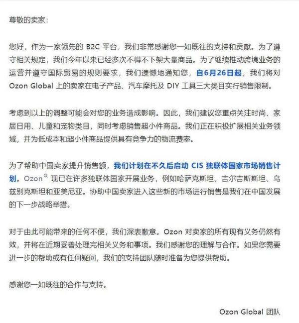 |Ozon官方称要对三大类目实施销售限制