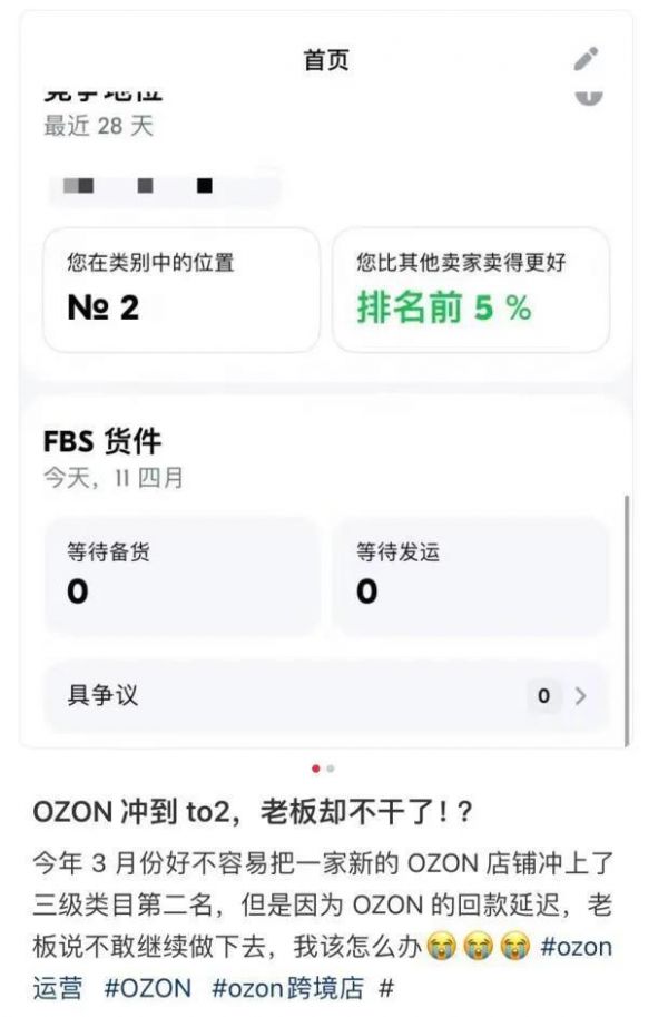 卖家晓日告诉骑鲸出海,他好不容易把一件单品做到了全Ozon的第二名,但老板因为回款问题,说这单品不做了,他欲哭无泪。在他发的小红书帖子下面,有人诉苦,称因为回款问题,公司已经裁了一整个部门了。