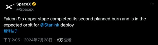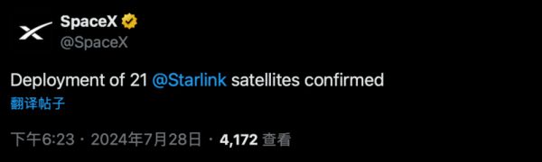 发射升空1个多小时后,SpaceX官方发布确认成功部署消息: