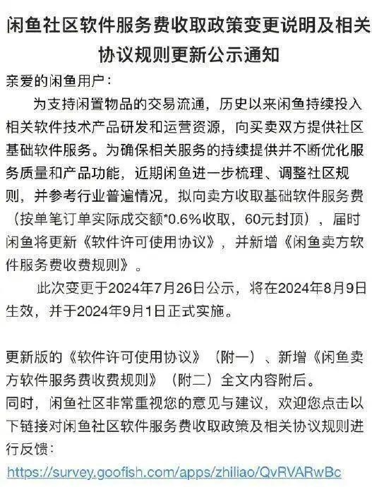 7月26日,闲鱼发布公示,宣布将面向全体卖家收取0.6%的基础软件服务费(单笔最高收取60元)。同时针对同一自然月内,产生的成交订单数量大于10件且累计成交金额大于10000元的卖家,超出后的每一笔订单实际成交额的1%收取软件服务费。