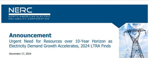NERC在其2024年长期可靠性评估报告中总结称,“随着需求增长持续飙升以及火力发电机宣布退役计划,未来10年北美大部分地区(大容量电力系统)都将面临越来越大的资源充足性挑战。”