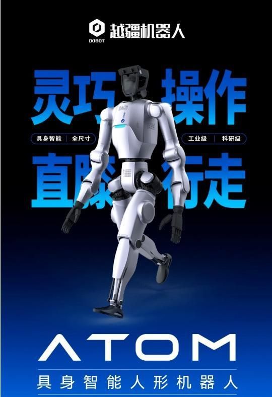 (图片来源:越疆机器人公司海报)Dobot Atom 是一款工业级操作类人形机器人,身高 1.53 米,体重 62 公斤,全身配置高达 41 个自由度的关节,实现了对人体关节运动逻辑的完整复刻。其 1:1 仿人手臂构型设计,搭载重复定位精度 ± 0.05mm 的 7 自由度工业级仿生协作臂、类人联动头颈和五指灵巧手,使其能够适应常见 700-1000mm 工作台高度的灵巧作业,并具有工业现场稳定通过能力。
