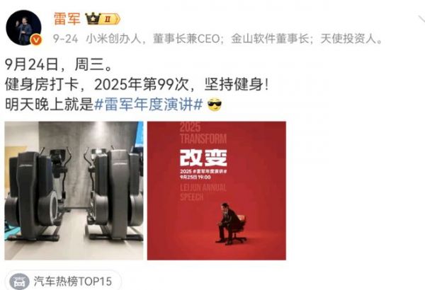 9月24日,雷军完成第99次健身房打卡,当时外界猜测其第100次健身打卡会在9月25日,也就是2025年度演讲当天完成。