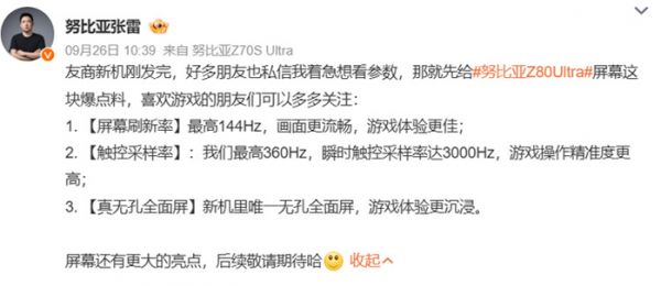 对于努比亚Z80 Ultra的这块屏幕,努比亚旗舰产品总经理张雷还透露到,努比亚Z80 Ultra拥有最高360Hz的触控采样率,瞬时触控采样率达3600Hz,游戏操控有更高的精准度,让努比亚Z80 Ultra也有好的游戏体验。而努比亚张雷还表示这块屏幕还有更大的亮点,暂时还未透露。