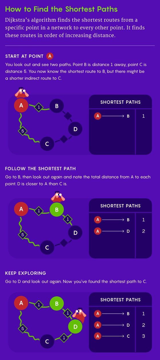 这种困境在计算机科学中最著名的难题之一中尤为突出:即从网络中的某个特定起点出发,寻找通往所有其他点的最短路径。这类似于你每次搬家后都需要解决的问题的“升级版”——学习从新家到工作单位、健身房和超市的最佳路线。