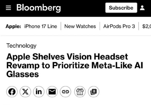然而在彭博社记者Mark Gurman近日的报道中却显示,苹果暂停了Vision Air的研发项目,转而加速推进“智能眼镜”的研发,并宣布对原项目人员进行转移。