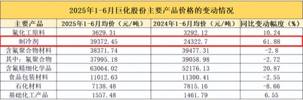 到2025年上半年,巨化股份的制冷剂均价达到3.94万元/吨,同比猛增了61.88%!即便是外销量同比下滑了4.19%,但强劲的价格增长弥补了量的缺口,进而让巨化股份的业绩大幅增长。