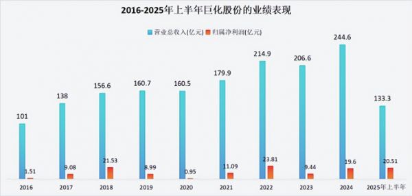 2025年半年报显示,巨化股份的营收和净利润分别实现133.3亿元、20.51亿元,同比增速达到10.36%、146.97%。
