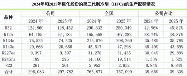 特别是,在R32这一关键品种上,2025年巨化股份的生产配额占国内总配额的45.82%,几乎是掌控了半壁江山,优势非常明显!