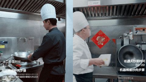 “我们能够做到一锅成菜,标准化还原。”杨建成举例,一道炒茄子,有的厨师先焯水再炒,机器人则直接炒。