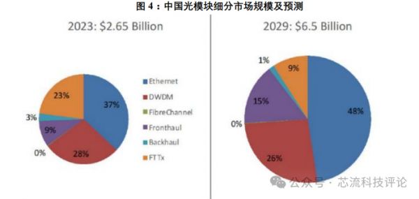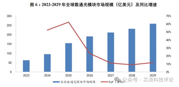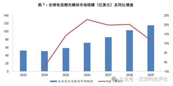 2023年,全球电信光模块市场规模已达到52.2亿美元,预计2029年增长至114.90亿美元,年复合增速约14%。