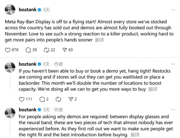AI眼镜的热度正持续上升。近日,Meta首席技术官安德鲁·博斯沃思(Andrew Bosworth)在Threads上发表文章称,Meta Ray-Ban Display智能眼镜在全国各地的线下零售店几乎全部售罄,11月之前的试戴预约也几乎全部排满。