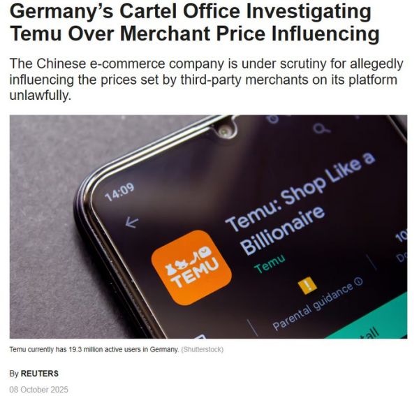 时间:2025年10月09日 14:12【因涉嫌干预卖家定价,拼多多旗下跨境电商平台Temu遭德国调查】