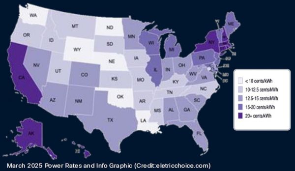 电价也是如此,全球各地的电价差异很大。以下是美国每千瓦时电价: