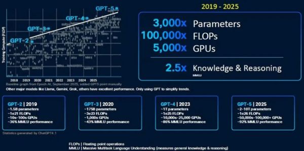 Chopra 向我们介绍了 GPU 集群的规模,以及数据中心内部和跨数据中心的各种网络,最终突破了数据中心 50,000 个 GPU 的门槛。以下是 OpenAI GPT 模型的演变历程,展现了模型构建者们正在努力应对的计算能力的指数级增长: