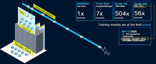 尽管这些路由器的容量看似超乎寻常,但人工智能正以前所未有的速度消耗着网络流量。随着人工智能模型的规模每年翻一番,训练它们所需的基础设施也随之膨胀。这使得超大规模数据中心的规模已经超出了其纵向和横向扩展的能力,唯一的出路就是跨规模扩展。这种跨规模迁移正在推动长距离流量的大幅增长。