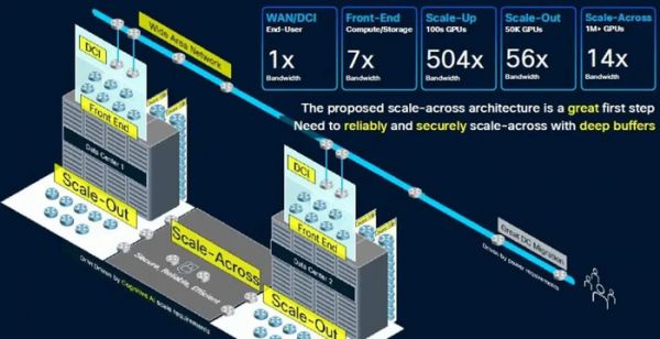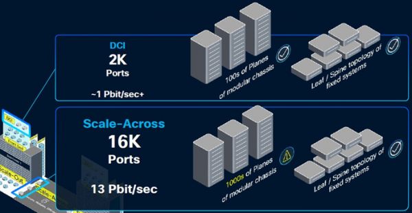 广域网和数据中心互连(DCI),正如我们在过去十年左右所熟知的那样,在性能和速度上都远远不足以承担跨多个数据中心扩展AI训练工作负载的任务。因此,Nvidia、Broadcom以及现在的思科系统公司创建了一种名为“跨网络扩展”(scale across network)的新型网络。