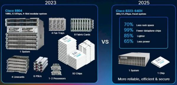 新发布的8223是一款 51.2 Tbps 路由器,搭载其自主研发的 Silicon One P200 ASIC。思科表示,结合 800 Gbps 相干光器件,该平台可支持高达 1,000 公里的传输距离。在连接足够多的路由器后,该架构理论上可实现每秒 3 EB 的总带宽,这足以连接当今最大的 AI 训练集群。