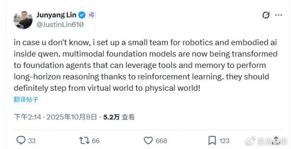 10月8日,通义千问技术负责人Justin Lin在社群平台X发文表示,公司已组建一支“小型机器人与具身AI 团队”,团队隶属于阿里巴巴的AI业务核心部门。Justin Lin指出,通义千问已开发出能处理声音、影像与文字输入的多模态模型,这些基础技术正逐步演进为能执行长期推理任务的“基础代理”(Foundation Agents),并应该从虚拟世界延伸到实体世界。