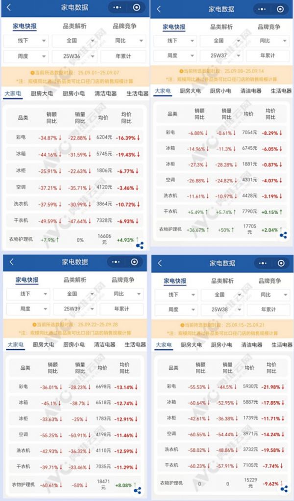 9月线下周数据显示,36周、38周、39周三周彩电、空调、冰箱和洗衣机四大类销售额、销售量大部分降幅在30%以上,特别是38周降幅都在40%-60%。9月多个品类均价同比也有明显下跌,量价额同时大跌实属罕见。线上周数据比线下稍微好点,但平均跌幅也在30%左右。由此研判今年9月家电销售大跌已成定局,10月黄金周家电销售也不乐观,预计这种下跌态势将延续今年三四季度。