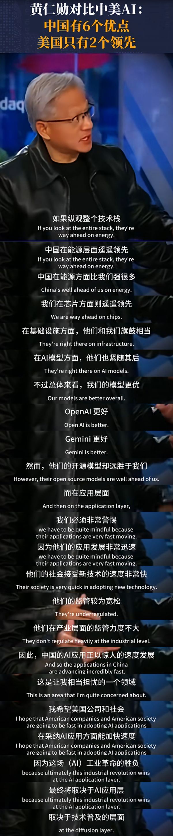 最近,英伟达的黄仁勋在一次访谈里,对比了中美AI的发展现状;
