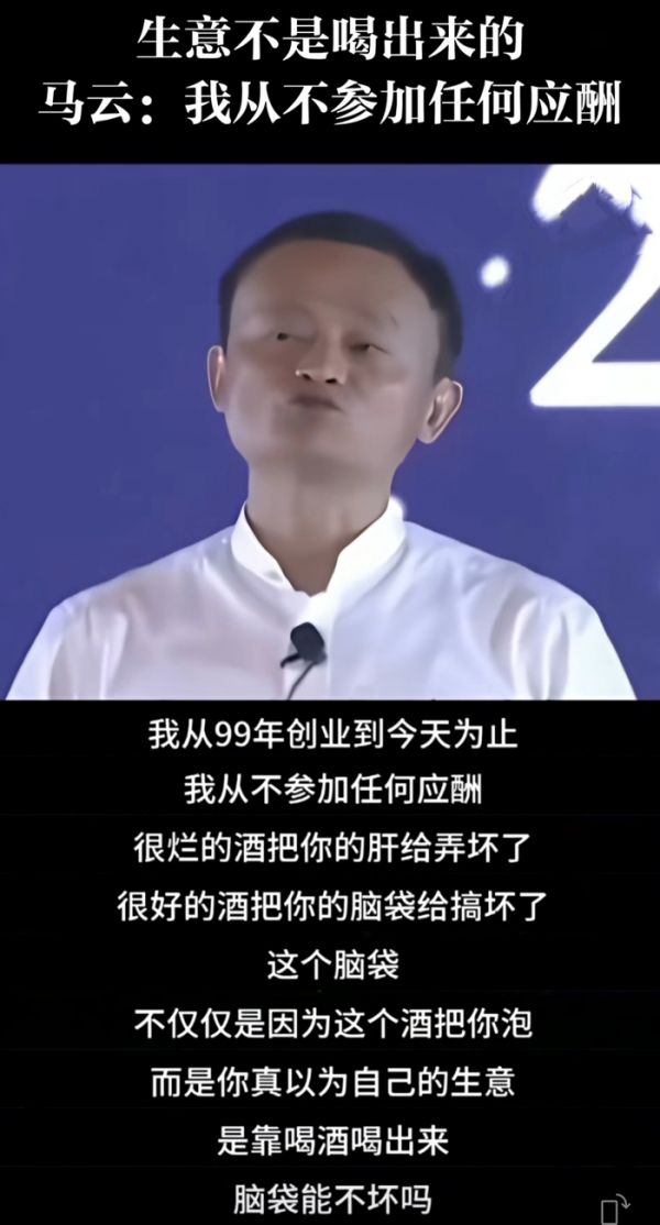从 1999 年创办阿里巴巴开始,马云就公开说自己从不参加应酬酒局。他的理由很实在:“很烂的酒把你的肝给弄坏了,很好的酒把你的脑袋给搞坏了”,更关键的是,要是真觉得生意靠喝酒就能成,那才是真的 “脑袋坏了”。