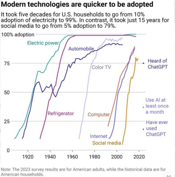 相比历史上其他的技术革命,电力、自动驾驶、压缩机、互联网、电脑、社交媒体等,AI技术被“采纳”的速度是“有史以来”最快的!