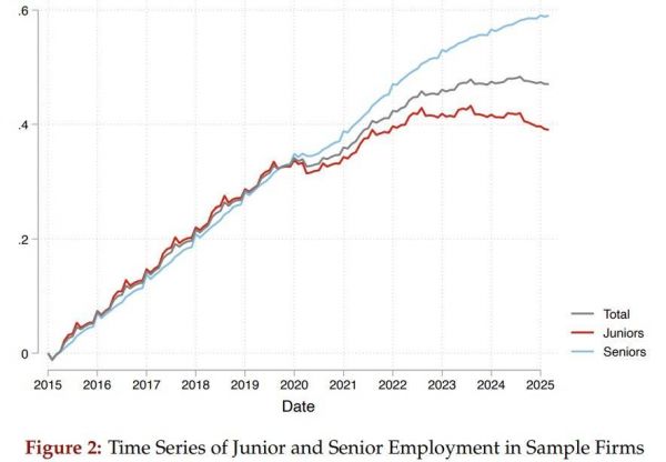 研究结果为“AI导致初级岗位减少”这一因果关系,提供了强有力的间接证据。