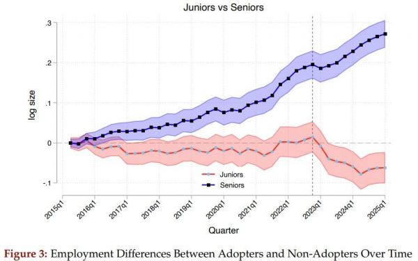 最终的结论十分清晰:随着生成式AI的普及,企业正愈发表现出“偏爱资历”的倾向,相较于经验丰富的员工,职场新人正受到更集中、更快速的冲击。
