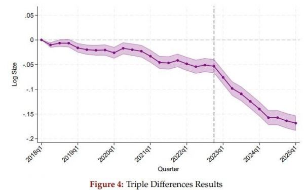 结果显示,从2023年第一季度开始,两条趋势线开始交叉。“AI采纳企业”的初级员工人数相对于非采纳企业出现了断崖式下跌。而在采纳AI六个季度之后,这些公司里的初级员工规模,相较于未采纳AI的公司,下降了约7.7%。