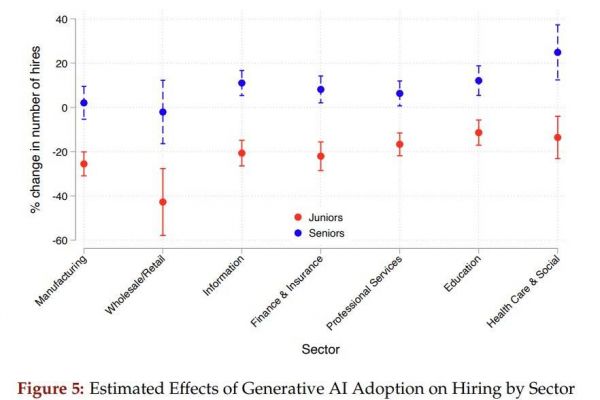 相比之下,在所有被分析的行业中,AI对资深岗位的招聘影响要么是积极的,要么在统计上不显著。