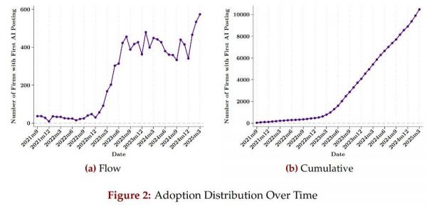 最终,约13万条招聘被精准标记。发布过这类职位的公司,就被定义为“AI采纳者”(积极应用生成式AI的企业),共计10,599家,约占样本总数的3.7%。这种方法研究的结果是更加关注企业拥抱AI的实际行动,而非仅仅停留在口头。