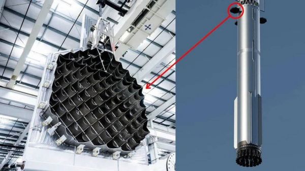 燃料供给系统方面,为了解决火箭回收着陆阶段的燃料稳定供给问题,三代星舰的一级火箭用一根直径惊人的巨型隧道管,替代了过去设计复杂的燃料“内贮箱”(Header Tank)。这根隧道管甚至比现役猎鹰9号火箭还要粗。