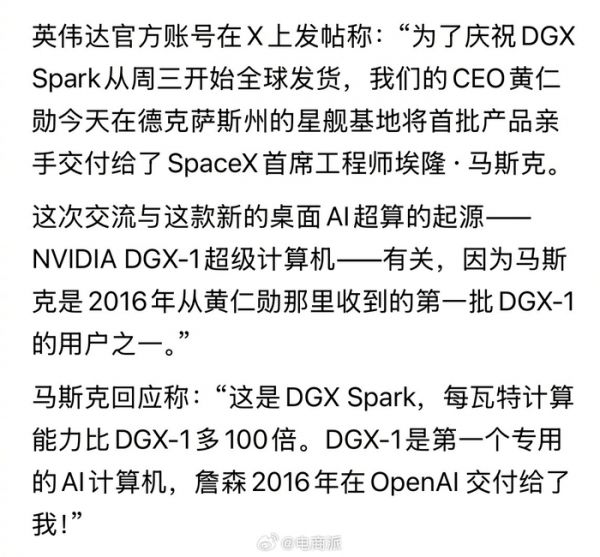 时间:2025年10月15日 02:25时隔 9 年,黄仁勋再次给马斯克送货上门,亲自交付全球最小AI超级计算机。