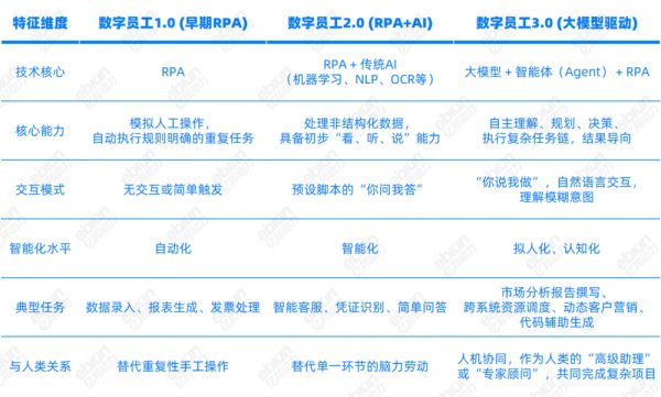 数字员工并不是新鲜事物。过去十年企业数字化的“效率利器”——机器人流程自动化(RPA)可以视为数字员工1.0阶段。
