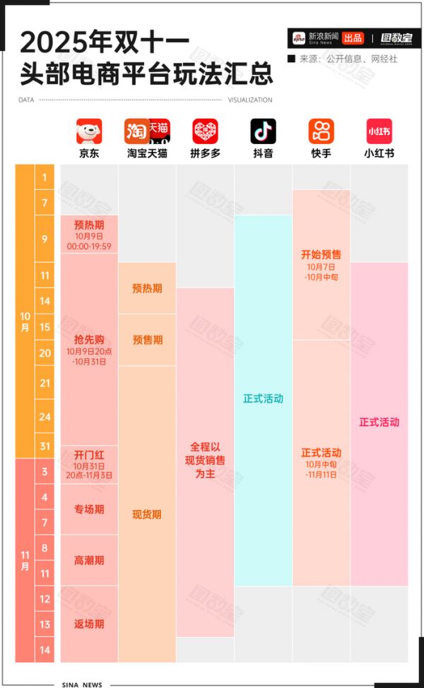 10月7日,快手抢先开启预售;抖音电商紧随其后,9日0点加入战局;京东于9日晚8点正式启动;小红书11日上线,大促持续超一个月;拼多多在14日“开门迎客”;淘天则于15日正式开始活动。
