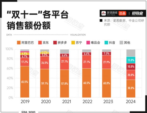 2025年,双十一步入第17个年头。尽管阿里巴巴依旧占据着最大的市场份额,但其份额正被后来者持续蚕食。特别是自2023年起,随着抖音、快手等短视频平台的强势入局,竞争格局愈发激烈,市场的蚕食与鲸吞正在加速。