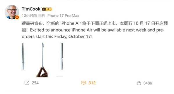 库克宣布国行iPhone Air将于22日正式发售:三大运营商已经准备完毕